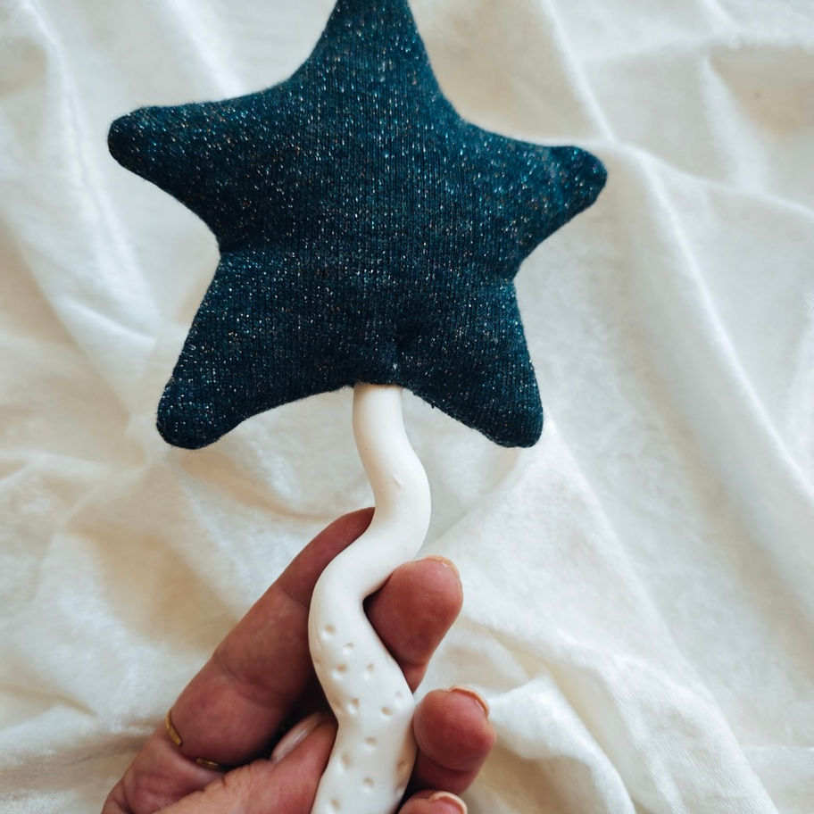 For kids and all who enjoy a little magic play. Navy blue cotton star with shiny rainbow threads on a clay white wand. Sized approx 20 cm of pure love.