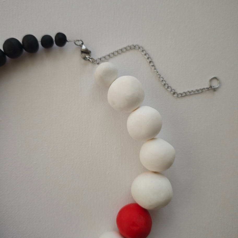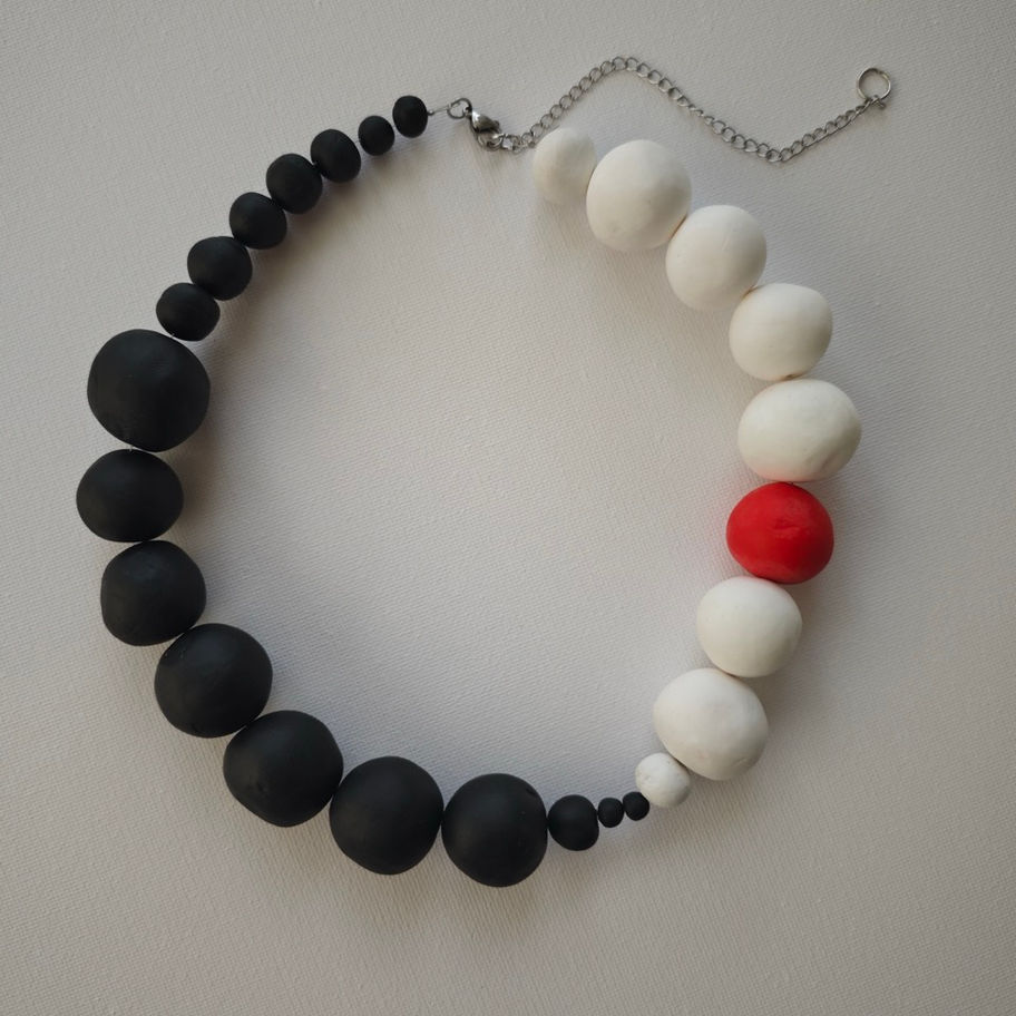 White and black hand made polymer clay beads with a single red bead making an impact. We dare to stand out, don't we?Hand made with stainless steel details.Back extension included.